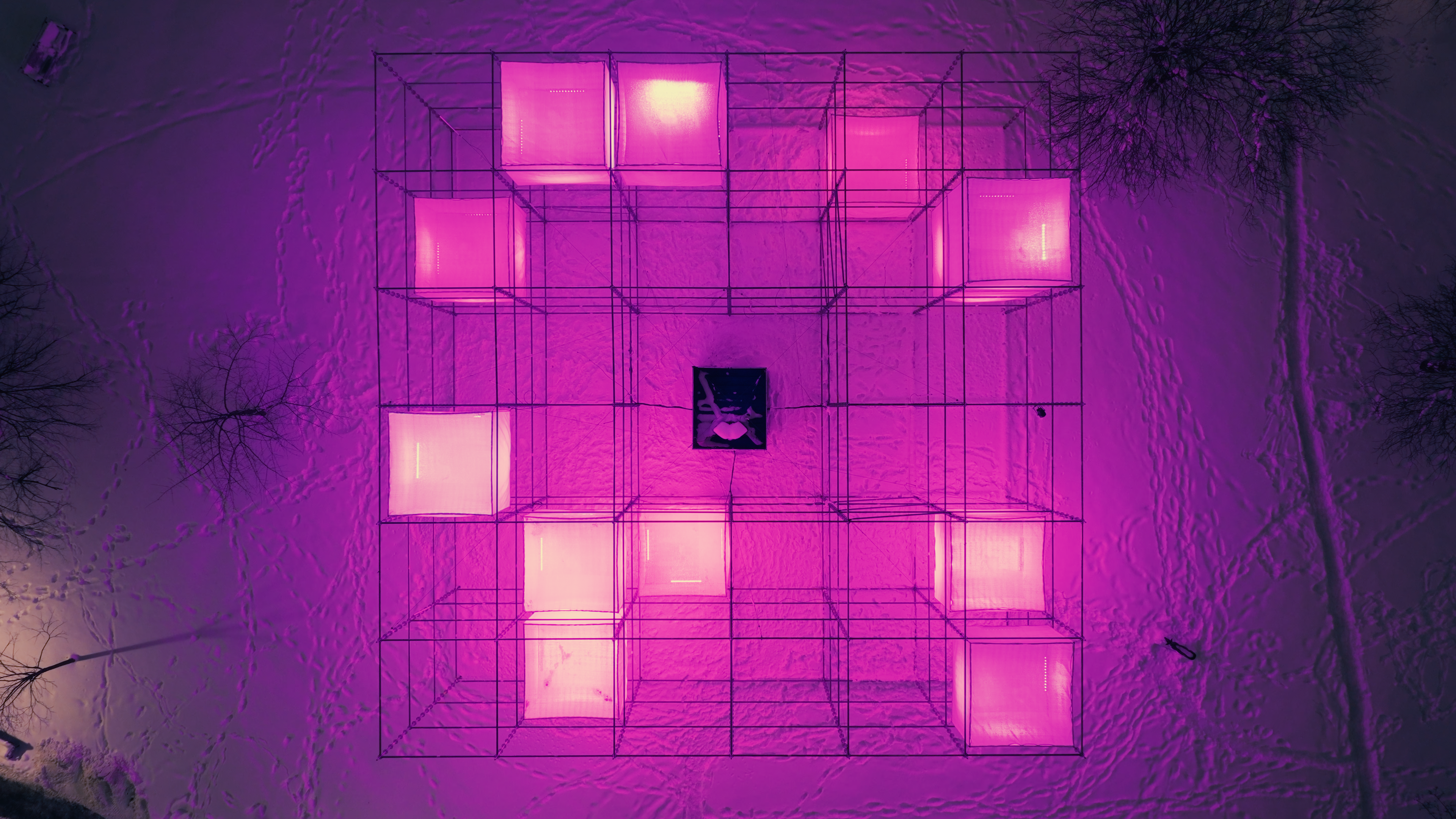 At the center of the installation is a container to which all the lights are connected. On top of it, two speakers are installed. Inside, you find the heart of the installation: a computer playing the synth in sync with the lights.